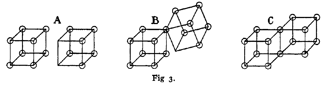루이스는 하나의 모서리를 공유하는 방식으로 원자들 간 단일 결합(Fig. 3. C)을 설명했으며, 두 모서리(하나의 면)를 동시에 공유하는 방식으로 이중 결합(Fig. 4. A)을 설명했다. 모서리와 면을 공유하는 방식을 통해 각각의 원자는 비활성 기체와 유사한 전자 배치를 가질 수 있으며, 이를 통해 분자의 형성 과정과 결합의 안정성을 설명하였다.