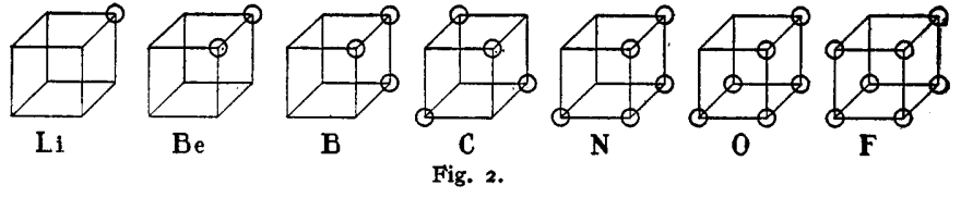 루이스는 중성 원자의 전자 껍질(궤도)을 입방체의 모서리로 나타내고, 전자를 각 꼭짓점에 위에 동그라미로 표현했다. 입방체 꼭짓점을 채운 전자 수가 원자의 화학적 행동(성질)에 대한 중요한 법칙으로 작용한다고 설명했다.