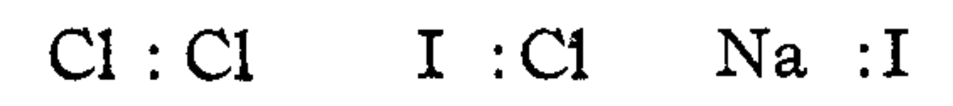 따라서 'BrCl'의 경우 상대적인 전자 치우침에 따라 Br :Cl 의 형태로, 'ICl'의 경우 I :Cl 의 형태로 나타낼 수 있으며, 결합의 극성 정도를 자유롭게 표현할 수 있어 무극성 물질에서부터 Na :I와 같은 이온성 화합물까지 폭넓은 적용이 가능하다고 주장했다.
