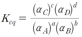 열역학적 평형 상수(K )는 화학 반응에 관여하는 물질의 활동도(activity, α)로 정의된다. 활동도는 용액 내 물질 간 상호작용을 반영한 값으로, 일종의 유효 농도(effective concentration)와 같다. 용액 내 다른 물질들과 활발하게 상호작용할수록 활동도 값은 1에서 크게 벗어난다.