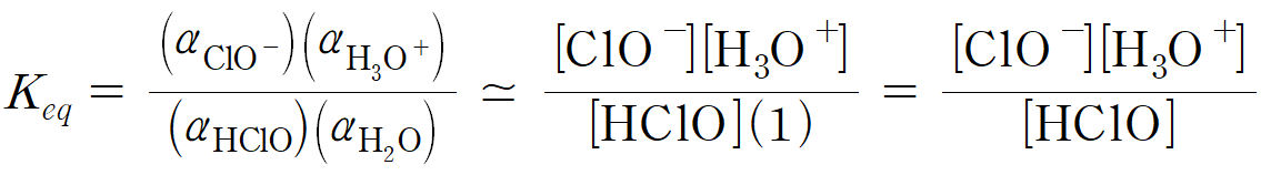 따라서 평형 상수의 용질 활동도는 몰농도 형태로 바꾸어 표현할 수 있다. 이 경우, 우리가 일반적으로 알고 있는 농도에 관한 평형 상수식이 나타난다.
