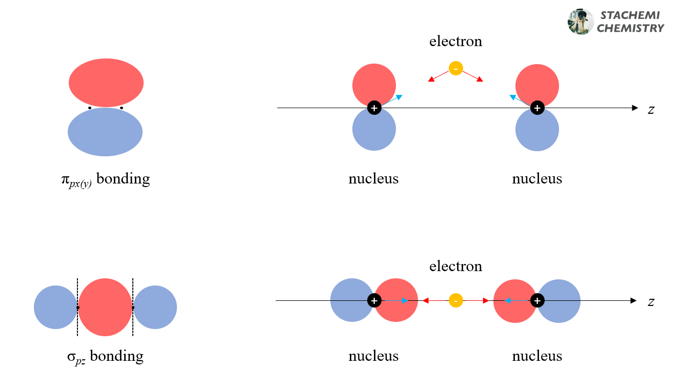 화학에서는 결합 방향을 z축으로 설정한다. 이에 따라 pz 오비탈은 언제나 결합 축과 평행하게(축 방향으로) 놓인다. 자연히 나머지 px, py 오비탈은 결합 축에 수직으로 벗어나 놓인다. 결합 축을 기준으로 구분된 두 세트(pz vs px(y))의 p 오비탈 간 겹침은 각기 다른 형태의 분자 오비탈을 만든다.