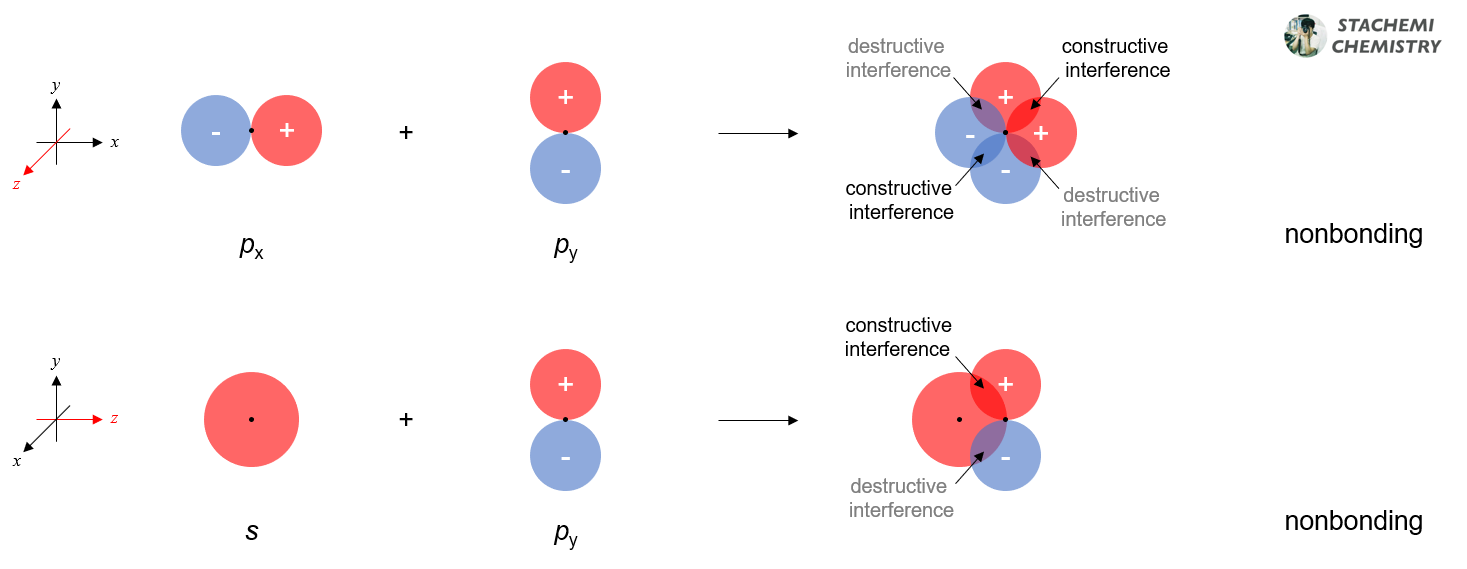 예를 들어 px와 py 오비탈은 서로 배향이 달라 알짜 겹침이 일어나지 못한다. 서로 다른 축에 놓인 두 (파동)함수를 더하는 꼴이다. x에 대한 함수식과 y에 대한 함수식을 더하고 빼는 행위와 같다.