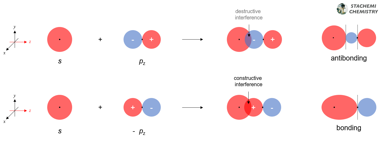 단, 결합 축 방향으로 놓인 pz 오비탈과 s 오비탈 간의 중첩에는 알짜 겹침이 발생한다. 만약, 두 오비탈의 에너지가 비슷하다면 <그림 4>와 같이 선형조합을 통해 분자 오비탈을 만들 수 있다. <그림 4>