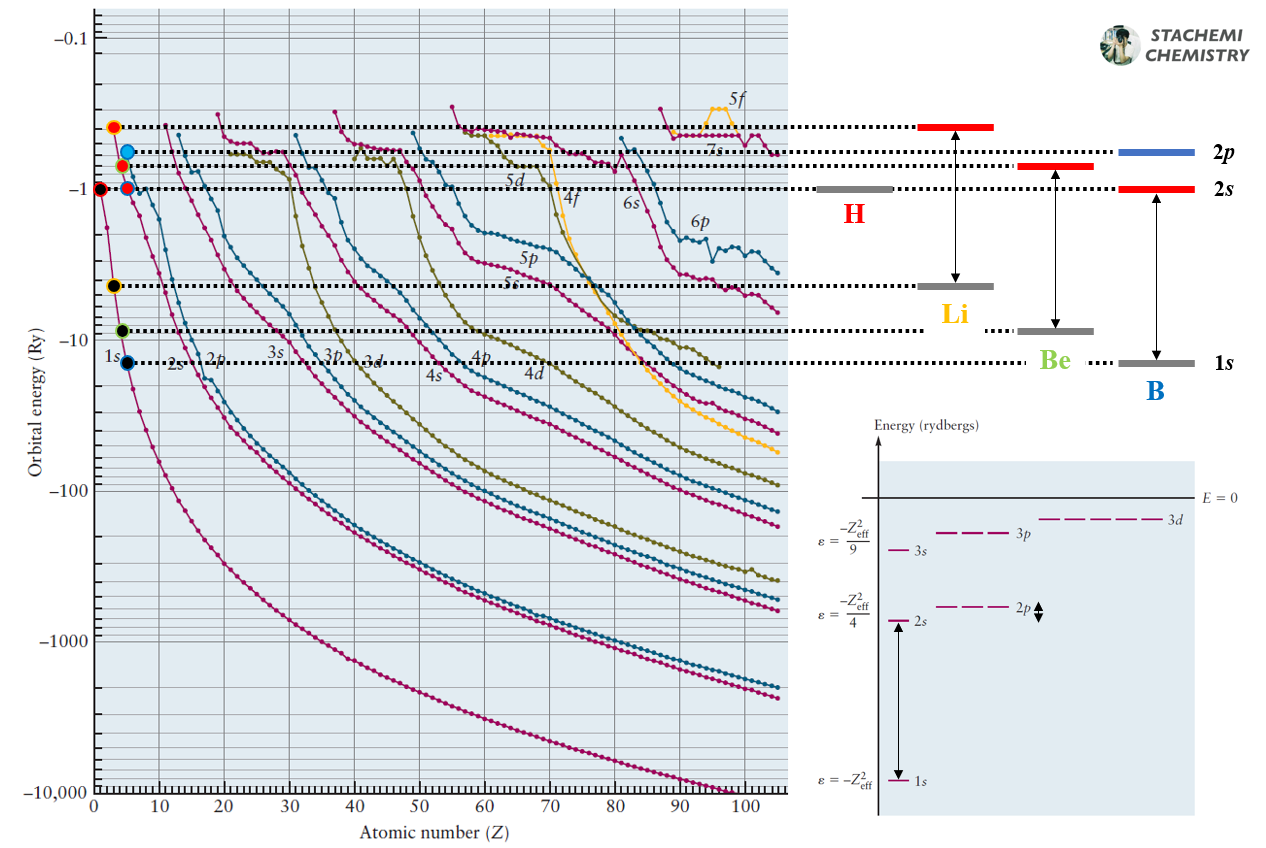 그림 2. 1s-2s 오비탈 사이 에너지 차는 2s-2p 오비탈에 비해 매우 크다. [출처] Oxtoby Principles of Modern Chemistry 7th, Fig 5.18, 5.25