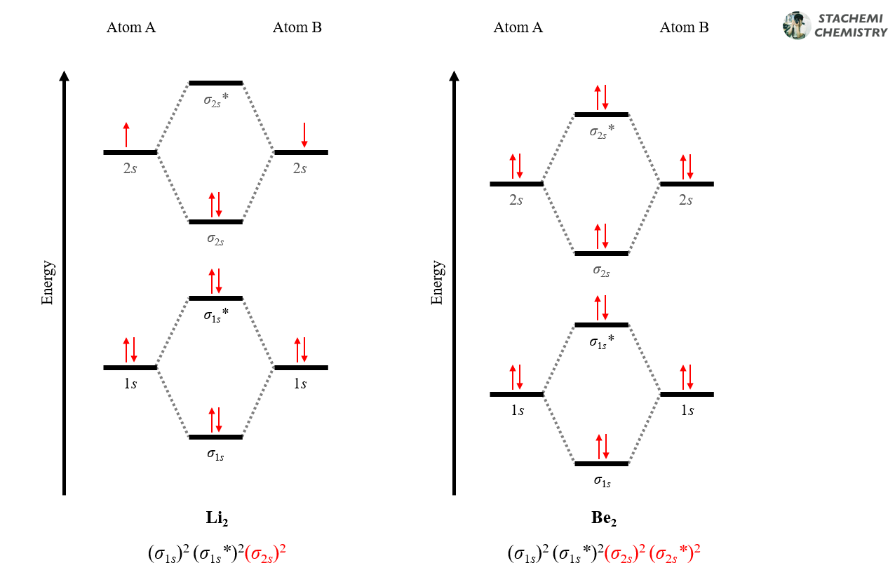 MO 상관 도표를 보면, Li2 분자는 결합차수가 1(단일 결합)이라는 사실과, Be2 분자는 결합차수가 0이어서 분자 형성을 통해 얻을 수 있는 에너지적 이득이 없다는 사실을 알 수 있다.