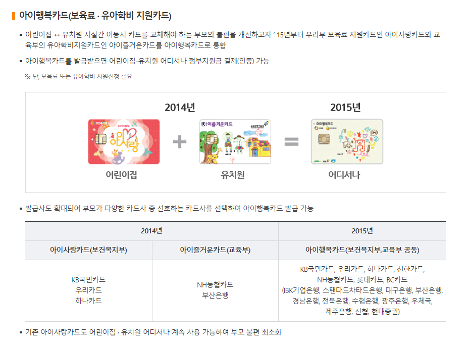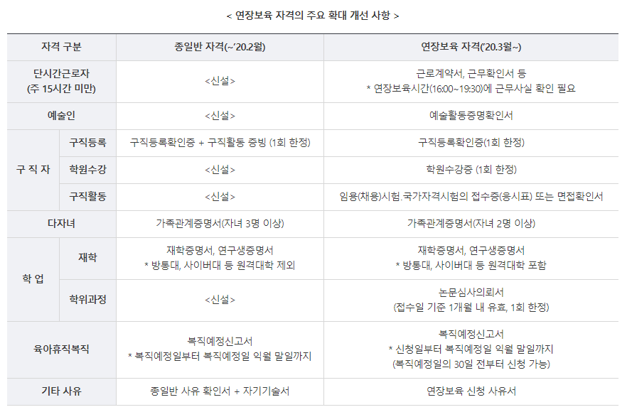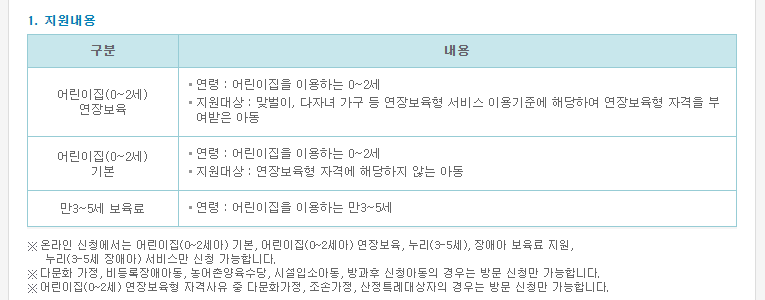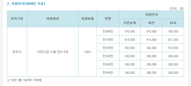 2020년 2월 까지는 보육료 지원이 [맞춤형], [종일형]으로 구분되어 있었으나 2020년 3월부터 [기본 보육]과 [연장 보육]으로 개편되었다. 다자녀 가구에 적용되던 연장 보육(이전의 종일반) 기준도 3 자녀에서 2 자녀로 완화되었다.