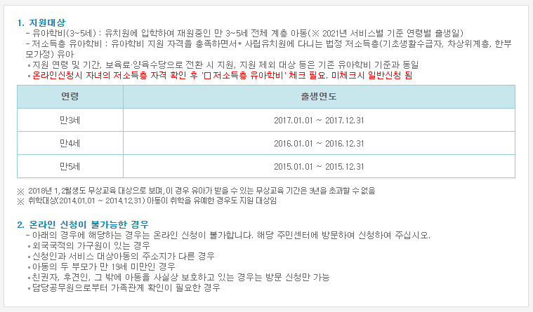 [유아학비]는 아이가 학교에 다니기 전까지, 즉 취학 전 아동(~만 5 세)의 유치원 비용(교육비)을 보조해주는 지원금이다. 본격적으로 학교에 다니기 시작하면, [유아학비]는 더 이상 지급되지 않는다.