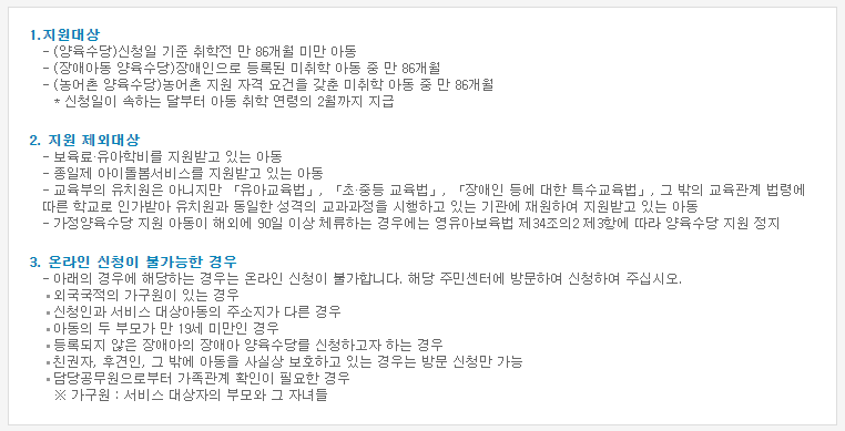 같은 이유로 [양육수당]을 받고 있는 가정은 보육 기관(또는 돌봄 서비스)을 이용하는 것이 아니기 때문에 [보육료]를 지원 받을 수 없다.