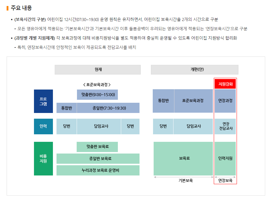 어린이집의 [기본 보육]과 [연장 보육]에 관한 자세한 내용은 보건복지부(www.mohw.go.kr) 정책 페이지와 보건복지부에서 제공하는 카드 뉴스 (다운로드)에 잘 정리되어 있다.