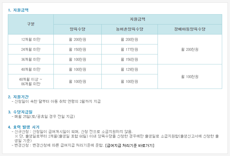 양육수당은 아동 개월 수에 따라 차등 지급한다. 12 개월 미만은 한 달에 20만 원, 24 개월 미만은 15만 원, 24 ~ 86 개월 미만은 월 10만 원이다. (보통 가정 기준)