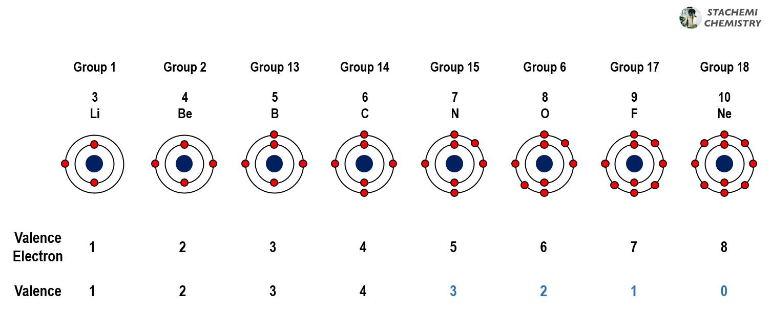 2 주기 원소의 원자가 전자수를 세어보면, 3리튬(Li) = 1 개, 4베릴륨(Be) = 2 개, 5붕소(B) = 3 개, 6탄소(C) = 4 개, 7질소(N) = 5 개, 8산소(O) = 6 개, 9플루오린(F) = 7 개, 10네온(Ne) = 8 개다. 그리고 다시 3 주기 1 족 11나트륨(Na)의 최외각 전자는 1 개가 되고, 1 ~ 8 값이 반복되며, 주기성을 보임을 알 수 있다.