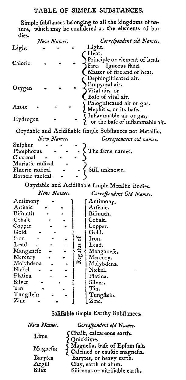 * 당시 라부아지에가 분류한 원소는 총 33종이지만, 여기에는 빛(light)과 열(heat) 등 현재의 원소 개념에 적합하지 않은 것들과 기술 부족으로 분리할 수 없었던 마그네시아(MgO), 알루미나(Al2O3), 실리카(SiO2) 등의 화합물들도 포함되어 있었다.