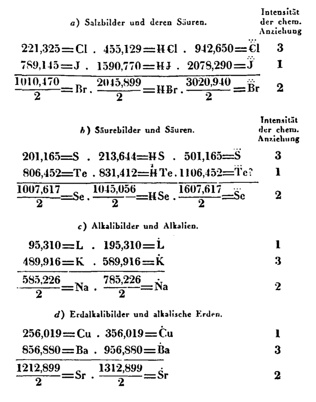 비슷한 화학적 성질을 갖는 원소들과 그 원소의 원자량 사이 상관관계를 찾으려 시도했던 최초의 인물은 시인 괴테의 화학 선생으로 알려진 되베라이너(Johann Wolfgang Döbereiner, 1780-1849)다. 그는 1816년, 스트론튬(Sr)의 원자량이 칼슘(Ca)과 바륨(Ba)의 평균값에 가깝다는 것을 알아냈다.