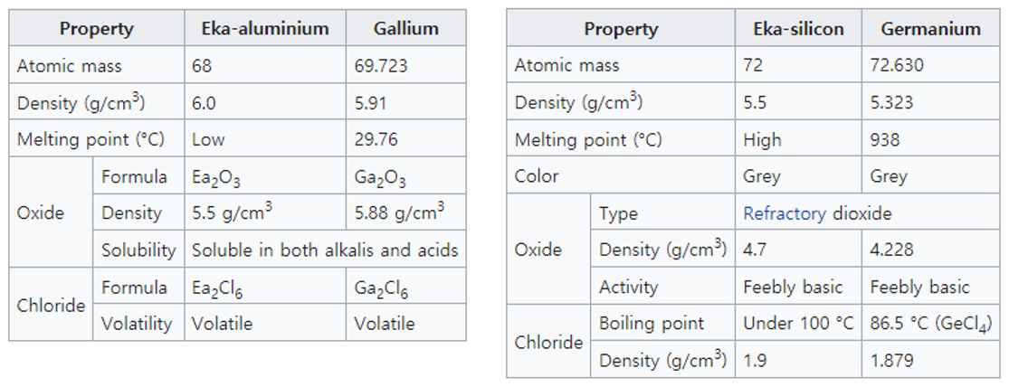 * 실제 원자량은 인듐(In) = 114.8, 텔루륨(Te) = 127.6이다. 인듐에 대한 예측은 정확했지만, 텔루륨은 빗나갔다. 텔루륨(127.6)과 아이오딘(126.9) 사이 원자량 역전은 주기율표에서 나타나는 예외 중 하나이다.