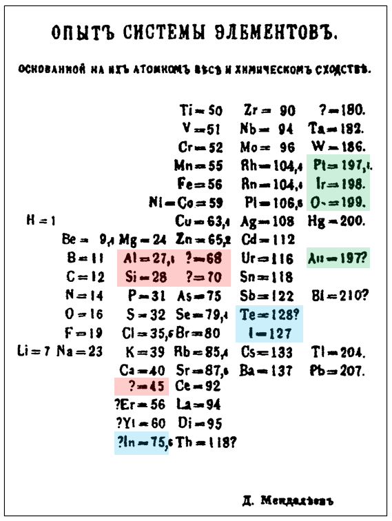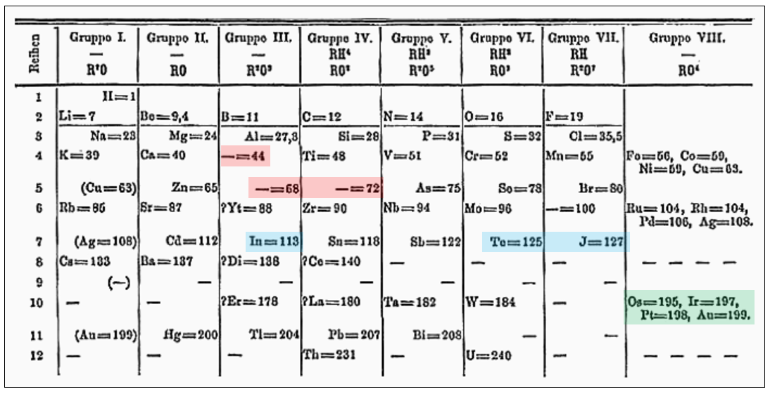 당시 인듐(In)의 원자량은 76, 텔루륨(Te)의 원자량은 128로 알려져 있었다. 인듐의 화학적 성질에 따르면, 알루미늄과 같은 그룹에 속하면서 동시에, 114에 가까운 원자량을 가져야 한다고 했다. 텔루륨은 아이오딘 원자량 127 보다 클 수 없으며, 123~126의 값을 가져야 한다고 생각했다. 이에 멘델레예프는 인듐(In) = 113, 텔루륨(Te) = 125으로 수정하여 표에 나타냈다.
