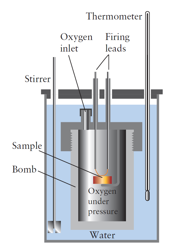 하지만, 물질마다 열용량이 다르기 때문에 모든 물질에 같은 에너지를 공급한다고 해서 같은 온도 변화가 나타나는 것은 아니다. 물질이 갖는 열용량의 차이에 따라 온도 변화의 정도가 다르다. 어쨌든, 일정 부피 조건에서는 공급된 에너지 전부가 온도 변화에만 사용되므로, 온도 변화를 통해 내부 에너지 변화를 알 수 있게 된다. 이것이 통 열량계(봄베 열량계)의 원리이다.