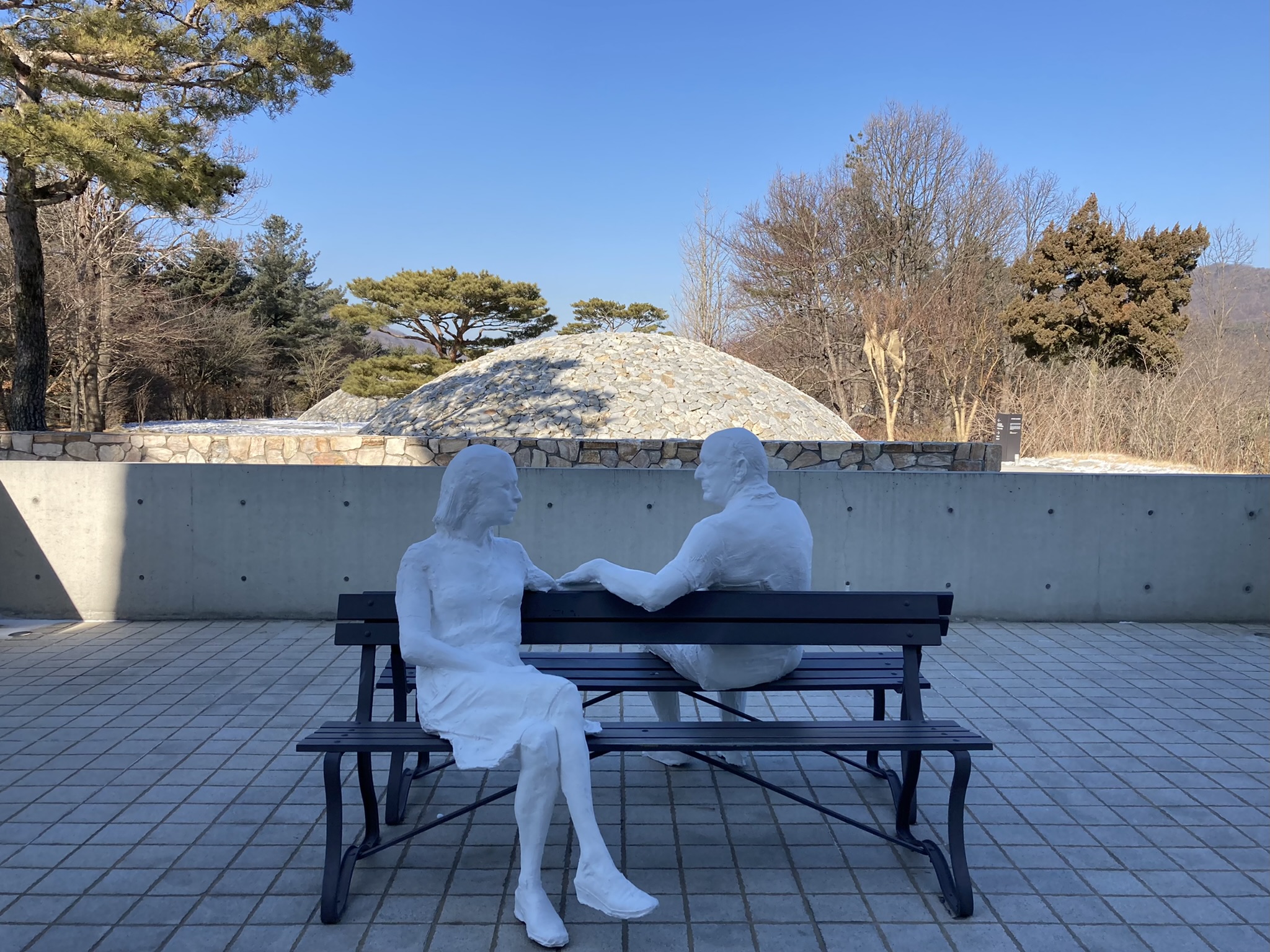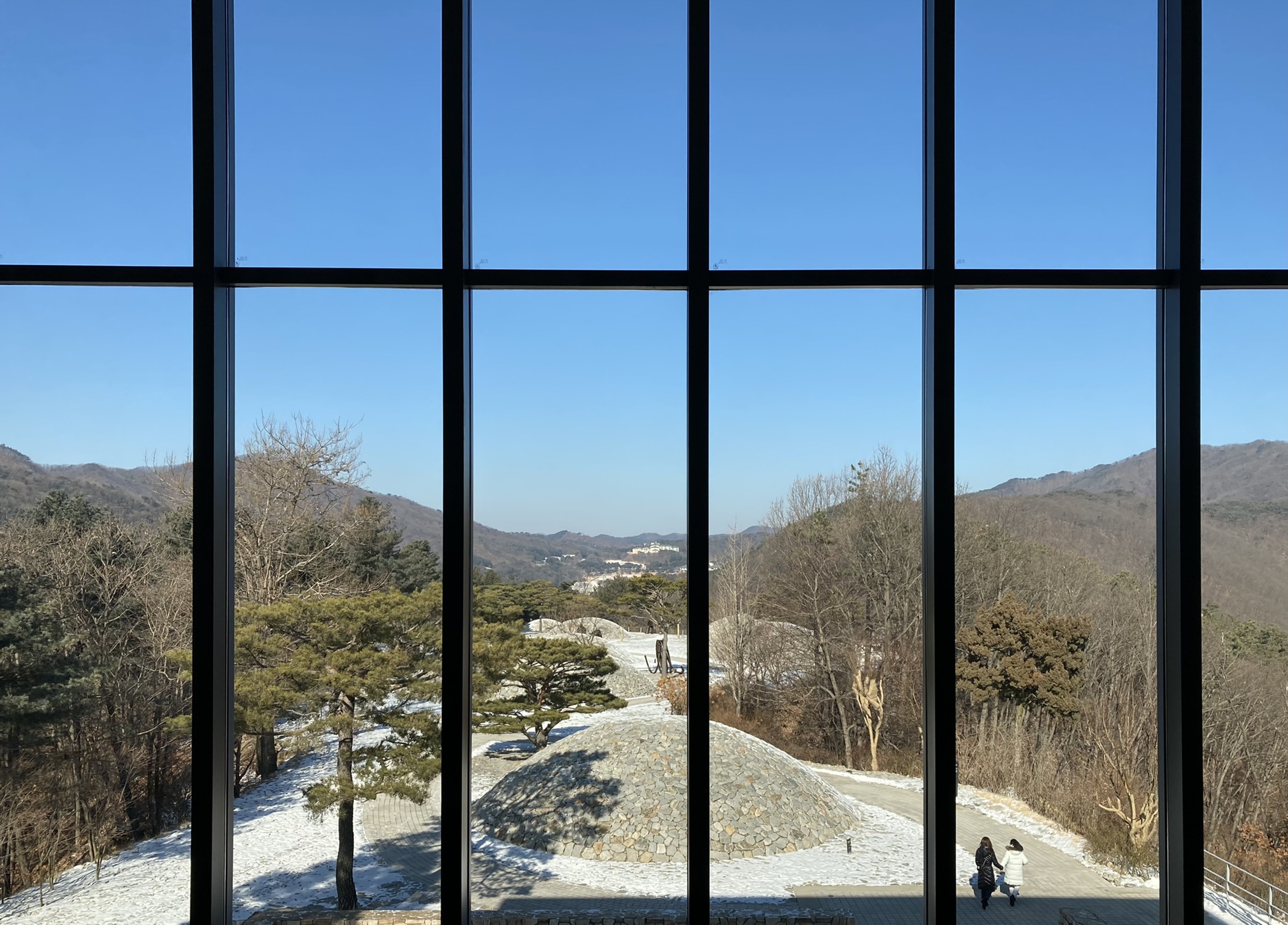 <명상관>과 <제임스 터렐관>을 가려면, 본관 뒷 편으로 나와 다시 외부 정원인 스톤 가든으로 나와야 한다. 출입구 바로 앞에 벤치가 놓여있고, 작품이 하나 있었는데 설명을 자세히 듣지 않아 정확한 내용은 기억이 나질 않는다. 명상관과 제임스 터렐관 체험을 모두 마치고, 다시 본관으로 돌아왔다. 제임스 터렐관의 전시는 두 번째였는데, 처음 만큼의 충격과 놀라움은 없었지만, 빛을 이용한 작품이라 역시 좋았다. 스톤 가든에는 고대 무덤을 연상하는 분봉들이 여럿 있는데, 추워서 사진을 못 찍었다. 명상관과 제임스 터렐관은 사진 촬영이 금지되어 있다.