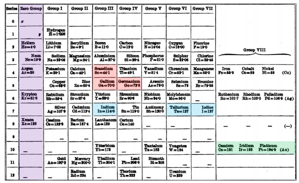 이후 1904년 멘델레예프 주기율표에는 Zero Group으로 비활성 기체가 추가되었다. (보라색)