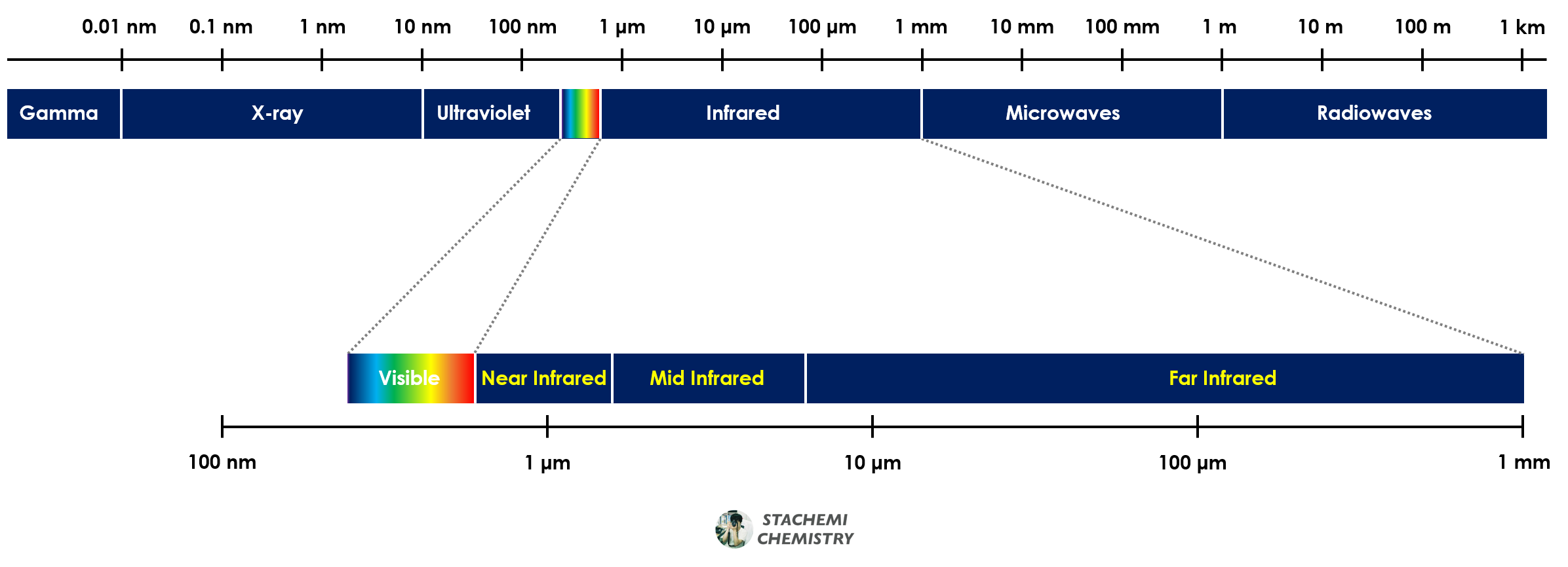 이를 분자에 적용해본다면, 분자를 진동시키기 위해서는 에너지가 필요하다. 분자를 진동시키기에 적절한 에너지의 빛은 적외선 영역의 빛이다. 적외선 영역은 가시광선이나 자외선에 비해 파장이 길다.