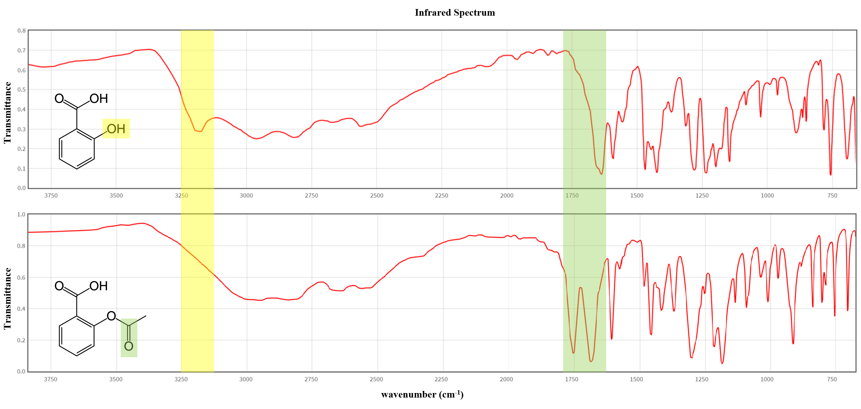 물론, 이번 글의 주제인 적외선 분광법을 통해서도 아스피린 합성 여부를 확인할 수 있다. 반응물인 살리실산과 생성물인 아스피린의 구조적 차이에 주목하자.