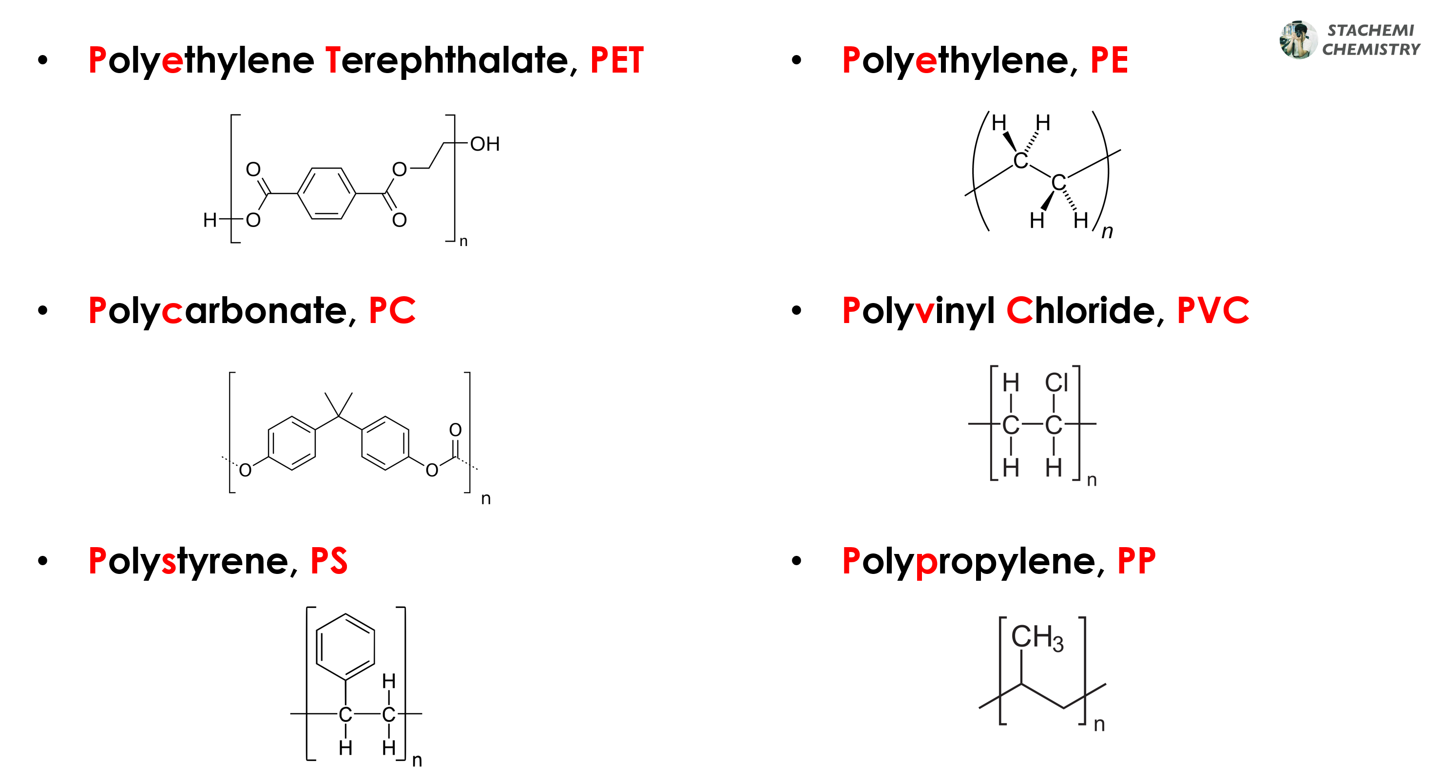 이는, 플라스틱이 수많은 결합을 갖는 것에 비해 결합 특성이 단순하다는 말이기도 하다. 폴리에틸렌(PE)는 탄소 두 개로 이루어진 에틸렌 분자(C2H4)를 단위체로 하여 반복되는 구조를 가지며, 폴리프로필렌(PP)은 프로필렌 분자(CH3CHCH2)가 반복된다.