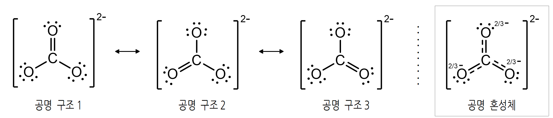 탄산 이온의 실제 구조는 위 <그림>에서의 공명 구조 1 ~ 3을 짬뽕하여 평균한 것에 가깝다. 그것이 <그림> 우측의 공명 혼성체(resonance hybrid)이다. 각각의 공명 구조가 1/3씩 적절하게 섞인 구조다.