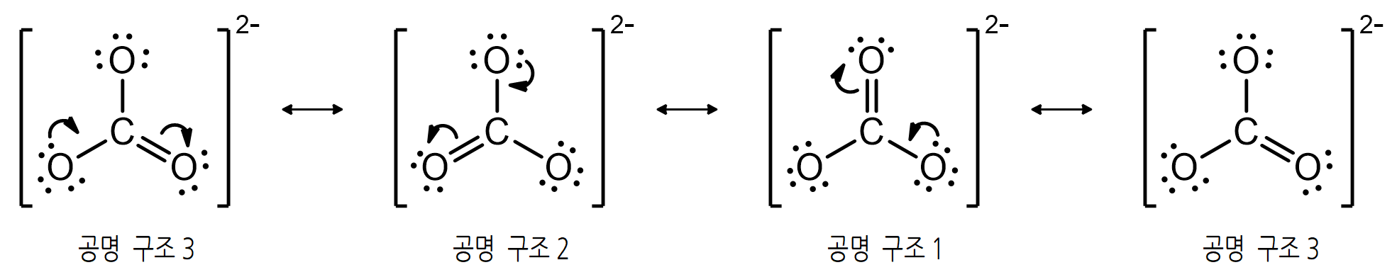 2) 공명 구조는 전자 이동에 의한 평형 구조(두 구조가 공존)가 아니다. 각 구조 사이 전자 이동을 화살표로 나타낸 것은 루이스 구조식 속에서의 전자 배치를 이해하기 위함일 뿐, 전자들이 실제로 이동하면서 두 구조를 진동한다는 뜻은 아니다.