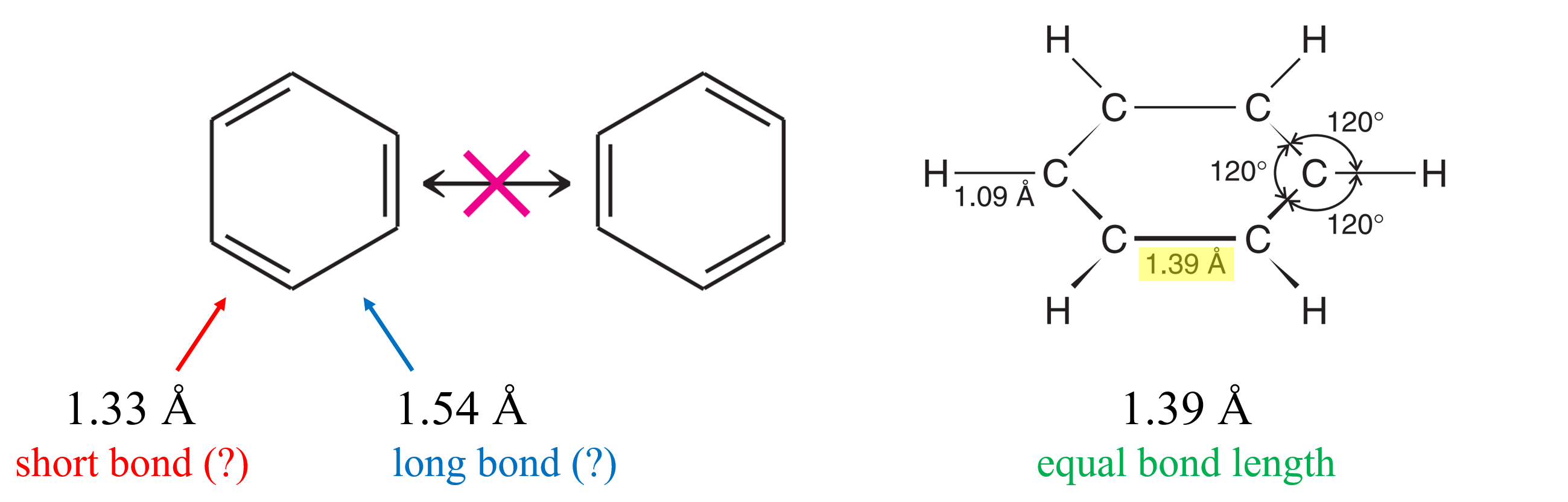 마찬가지로, 벤젠(Benzene, C6H6)이 두 가지 공명 구조를 빠르게 왔다 갔다 하는 것이라면, 특정 순간에 포착된 벤젠의 탄소-탄소 결합 길이는 133 pm의 C=C 이중 결합과 154 pm의 C-C 단일 결합 두 가지로 관찰되어야 할 것이다. 하지만 벤젠의 고리내 모든 탄소-탄소 결합 길이는 139 pm 뿐이다.