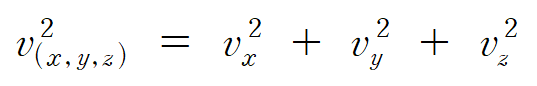 기체 입자는 x, y, z 축 방향으로 자유로운 이동이 가능하다. 이를 피타고라스 정리를 통해 식으로 표현하면, 다음과 같다.