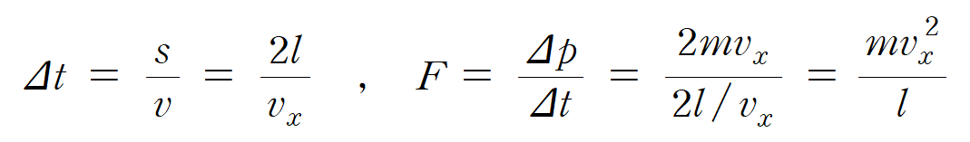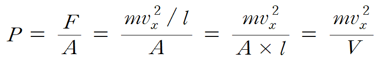 기체 입자 1 개가 벽면에 가하는 압력(P )의 크기는 충격력(F )을 면적(A )으로 나누어 구할 수 있으며, 다음과 같다.