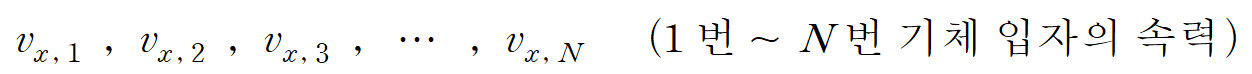 이제 상자 속 기체 입자의 수를 늘려보자. 상자 속에 x 축 방향으로만 운동하는 기체 입자가 총 N 개가 있다. 기체 입자 각각은 다양한 속력 분포를 가질 수 있다. 1 번 입자의 속력은 vx,1 , 2 번 입자의 속력은 vx,2 로 나타낼 수 있다. N 번째 입자의 속력은 vx, N 으로 나타낼 수 있다.
