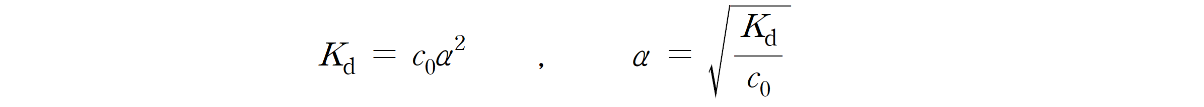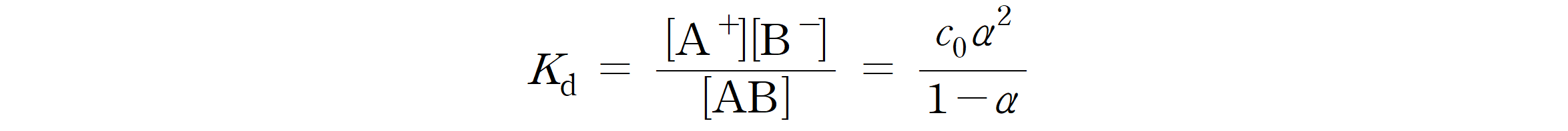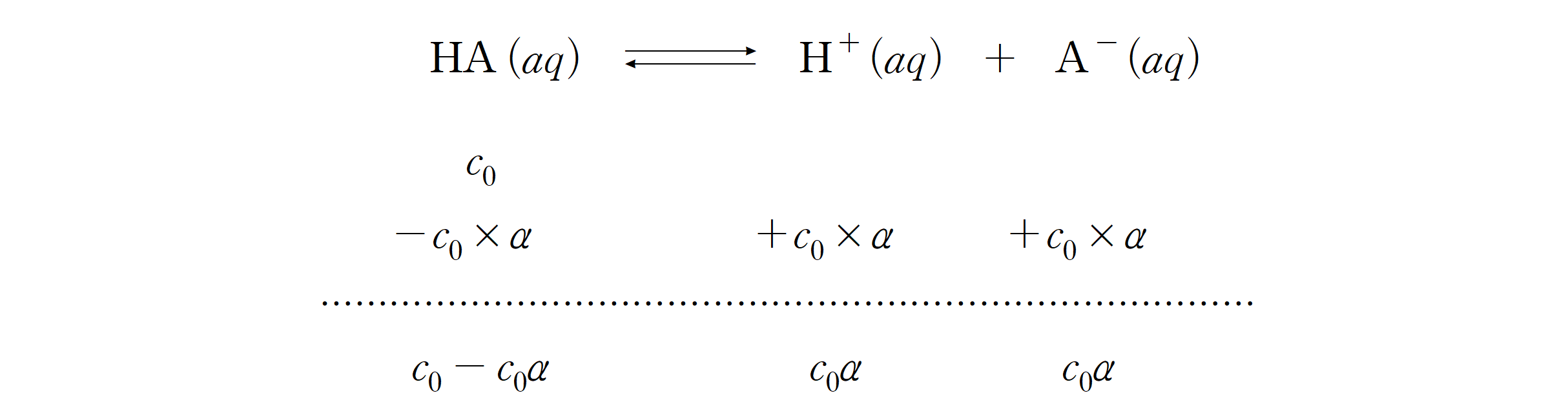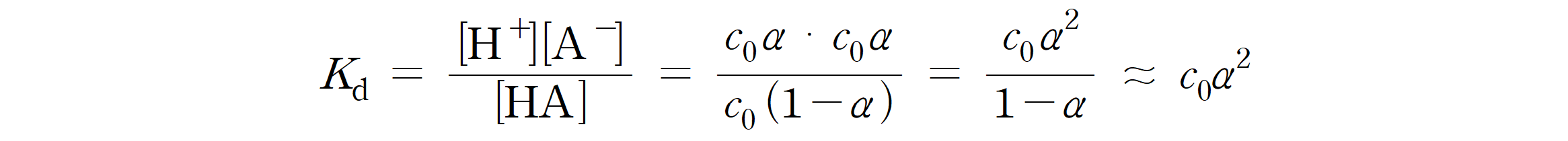 평형 상태에서의 약산의 농도는 c0 - c0*α 이며, 공통항인 c0로 묶어 c0(1 - α )와 같이 표현할 수 있다. 평형에서의 농도를 이온화 상수식에 대입하면, 다음과 같이 표현 가능하다.
