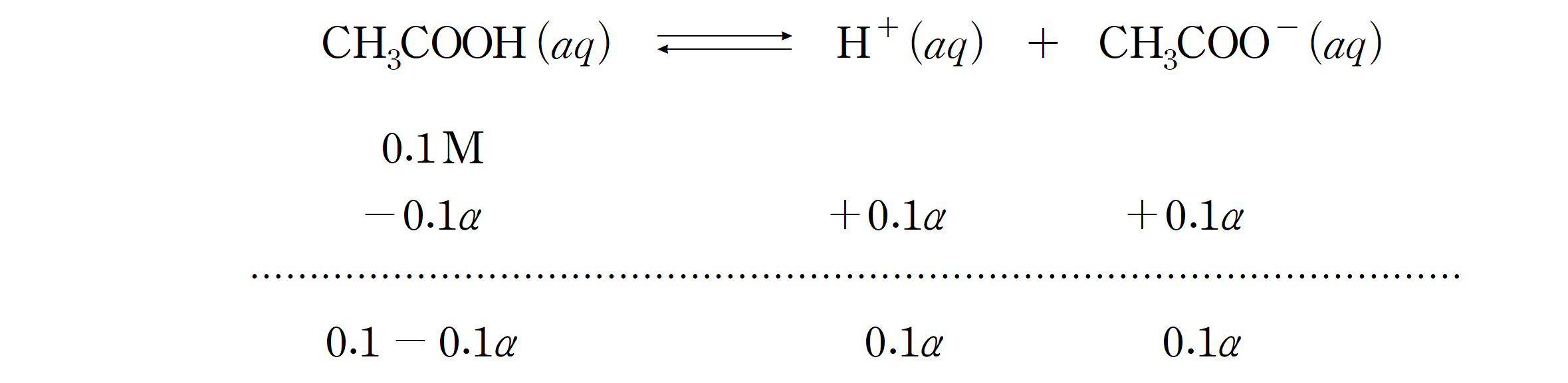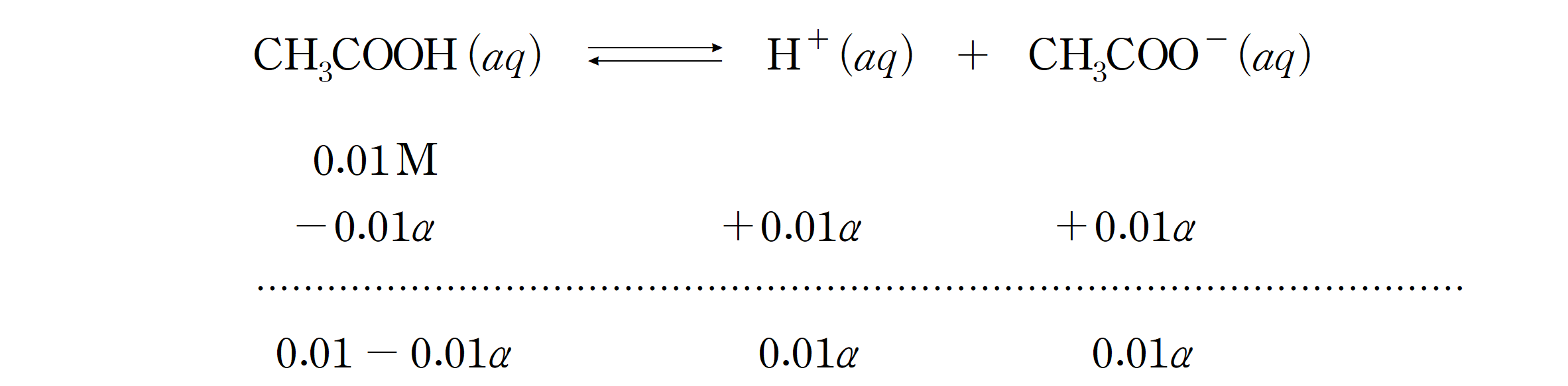 0.1 M 아세트산이 진한 용액, 0.01 M 아세트산을 상대적으로 묽은 용액이라 하자. 위에서 이끌어낸 결론에 그냥 대입해도 되지만 0.1 M 용액에 대하여 간략하게 풀이를 해보면,