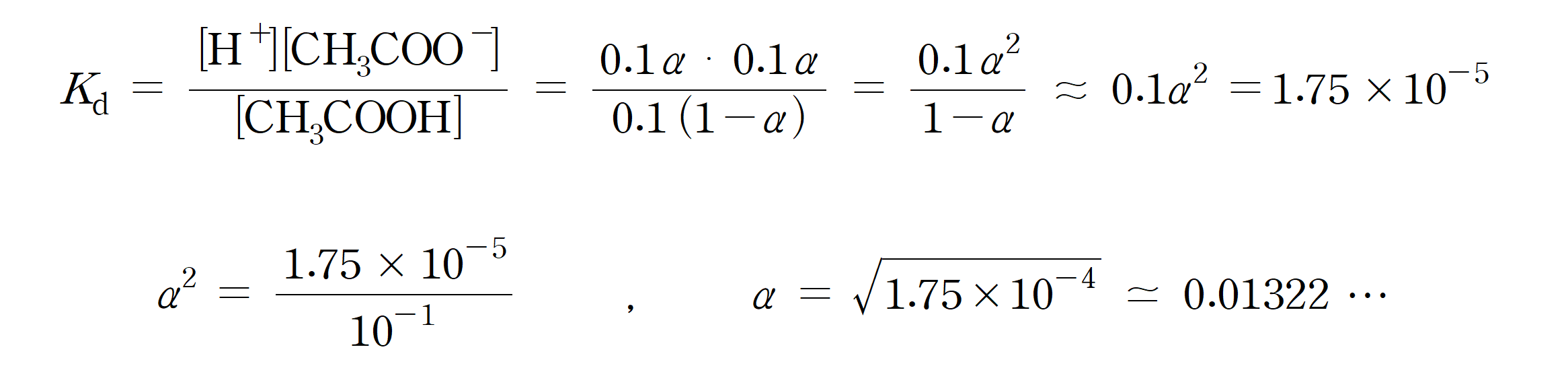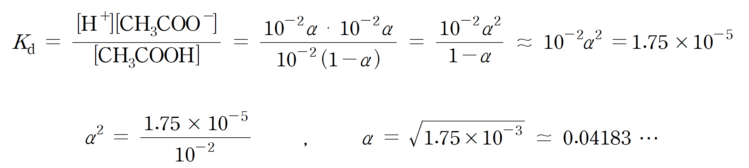 0.1 M 아세트산(CH3COOH) 수용액의 이온화도(α )와 0.01 M 아세트산 수용액의 이온화도를 비교해보자. (단, 아세트산의 산 이온화 상수 Kd = 1.75 × 10-5 이다.