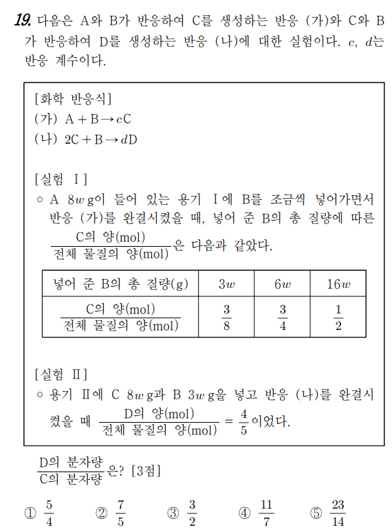 실험 II에서 반응 전 총 11w [g]의 반응물을 넣었고, 남은 것은 4 mol의 D와 1 mol의 B이다. 1 mol의 B가 w [g]이므로, 생성된 4 mol의 D의 질량은 10w [g]이다. D의 분자량은 다음과 같다.D 분자량 = 10w/4 = 5w/2 [g/mol]