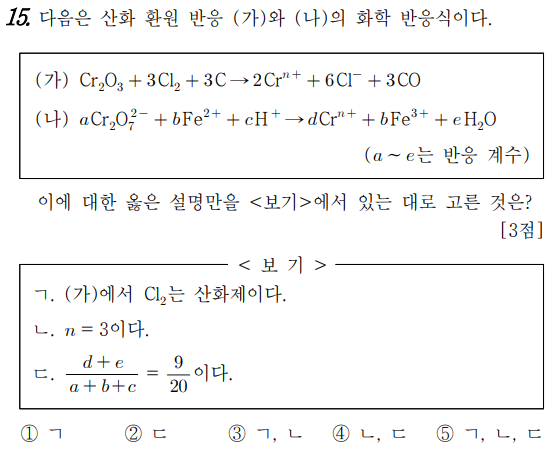 의외로 크롬(Cr)의 산화수가 변하지 않았다. 반응 (가)에서 산화수가 변한 원소는 염소(Cl)와 탄소(C)이다. 염소는 0에서 -1로 산화수가 감소하였으므로 환원되었다. 탄소는 0에서 +2로 증가하였으므로 산화되었다. 원자 개수까지 고려해보면, 총 6개의 전자가 관여했음을 알 수 있다.