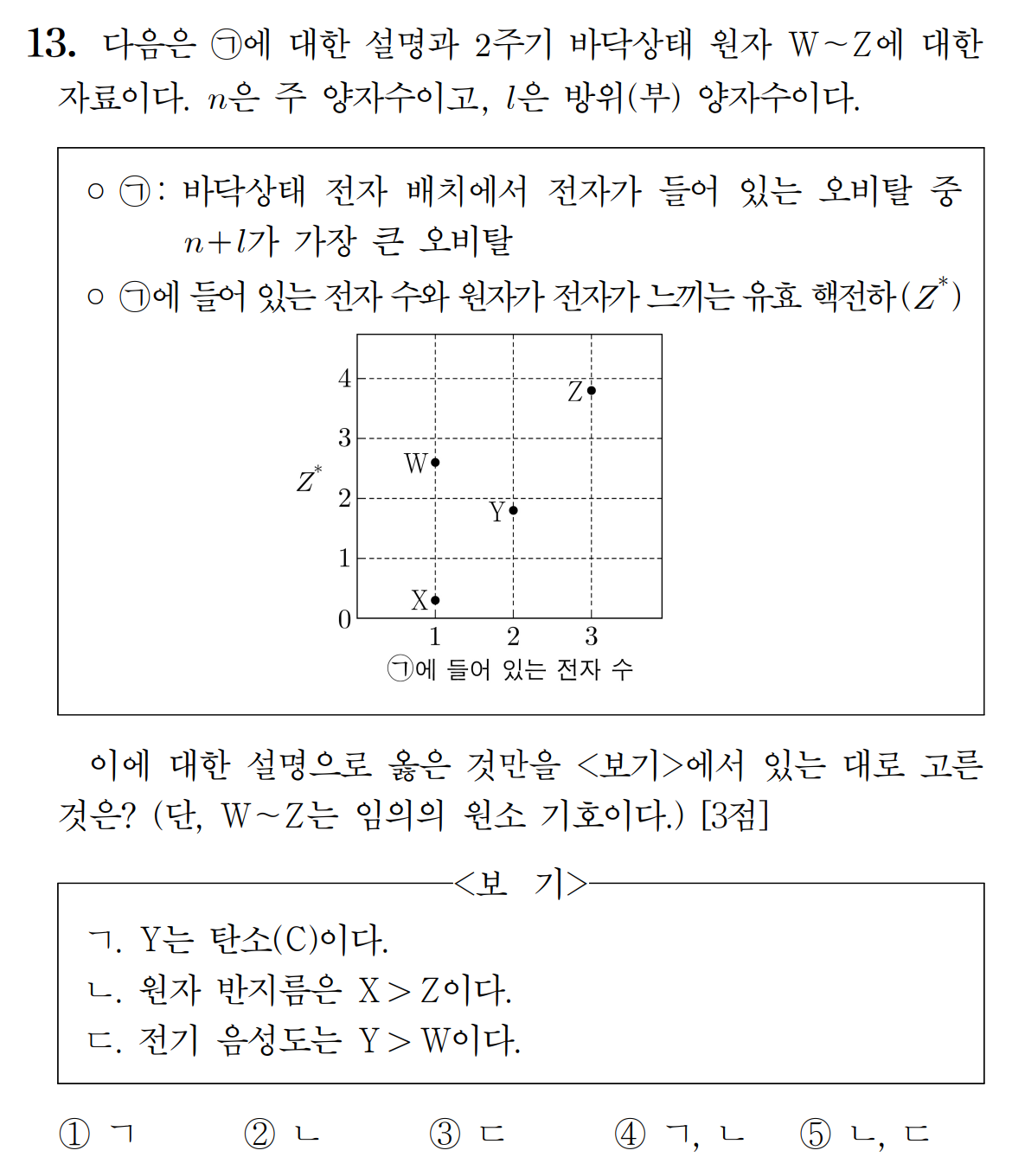 나머지 W, Y, X 는 질소보다 원자번호가 작은 원소들이다. W와 Y의 관계로부터 Y의 (ㄱ)은 2p가 아님을 알 수 있다. 만약, Y가 2p 오비탈에 2개의 전자가 들어있는 탄소라면, W를 정의할 수 없다. 따라서 W = 붕소(B), Y = 베릴륨(Be), X = 리튬(Li)이 되어야 한다.