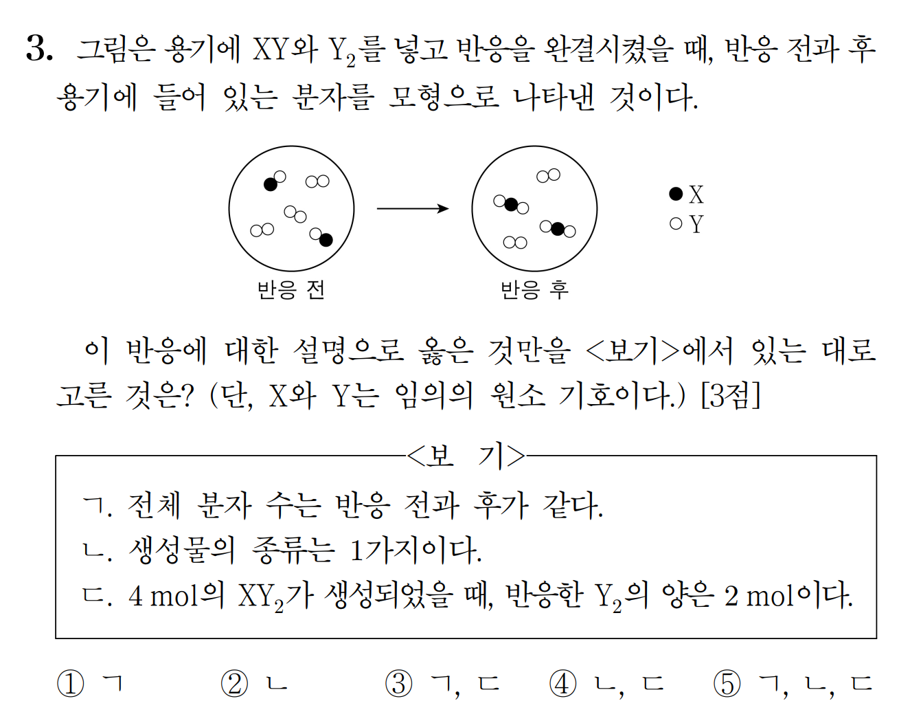 모든 문항을 모두 풀어 정리해두기에는 시간이 너무 지날 것 같아서 3점 문항만 풀이를 해둔다. 요즘 시간을 끌기 위해, 적은 정보만 주고, 이리저리 꼬아댔던 경향에 비하여 3점 문항은 전체적으로 쉽게 출제되었던 것 같은 느낌이 있다. 하지만, 오히려 비킬러 2점 문항 중에 시간이 걸렸을 것 같아 보이는 문제가 몇몇 보이니, 학생들이 느끼는 체감 난이도는 비슷했을 것 같다. 여전히 수능 화학에 대해서는 마음에 드는 부분도, 마음에 들지 않는 부분도 함께 있다.