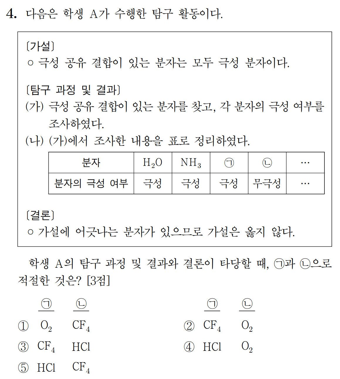 따라서 (ㄱ) HCl, (ㄴ) CF4가 적합하다. 참고로, O2는 무극성 공유 결합 + 무극성 분자, HCl은 극성 공유 결합 + 극성 분자, CF4는 극성 공유 결합 + 무극성 분자의 예시가 될 수 있다.