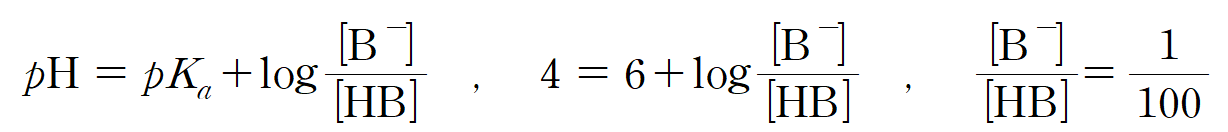 pKa = 6인, HB 용액의 pH가 4라는 뜻은 짝산 : 짝염기 비율이 100 : 1 이라는 뜻이고, [B-] 분율 b = 1/101이 된다.