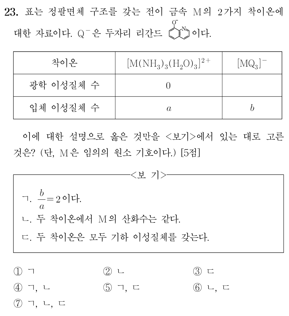ㄷ. 두 착이온 모두 facial, meridional 기하 이성질체를 갖는다. (참)