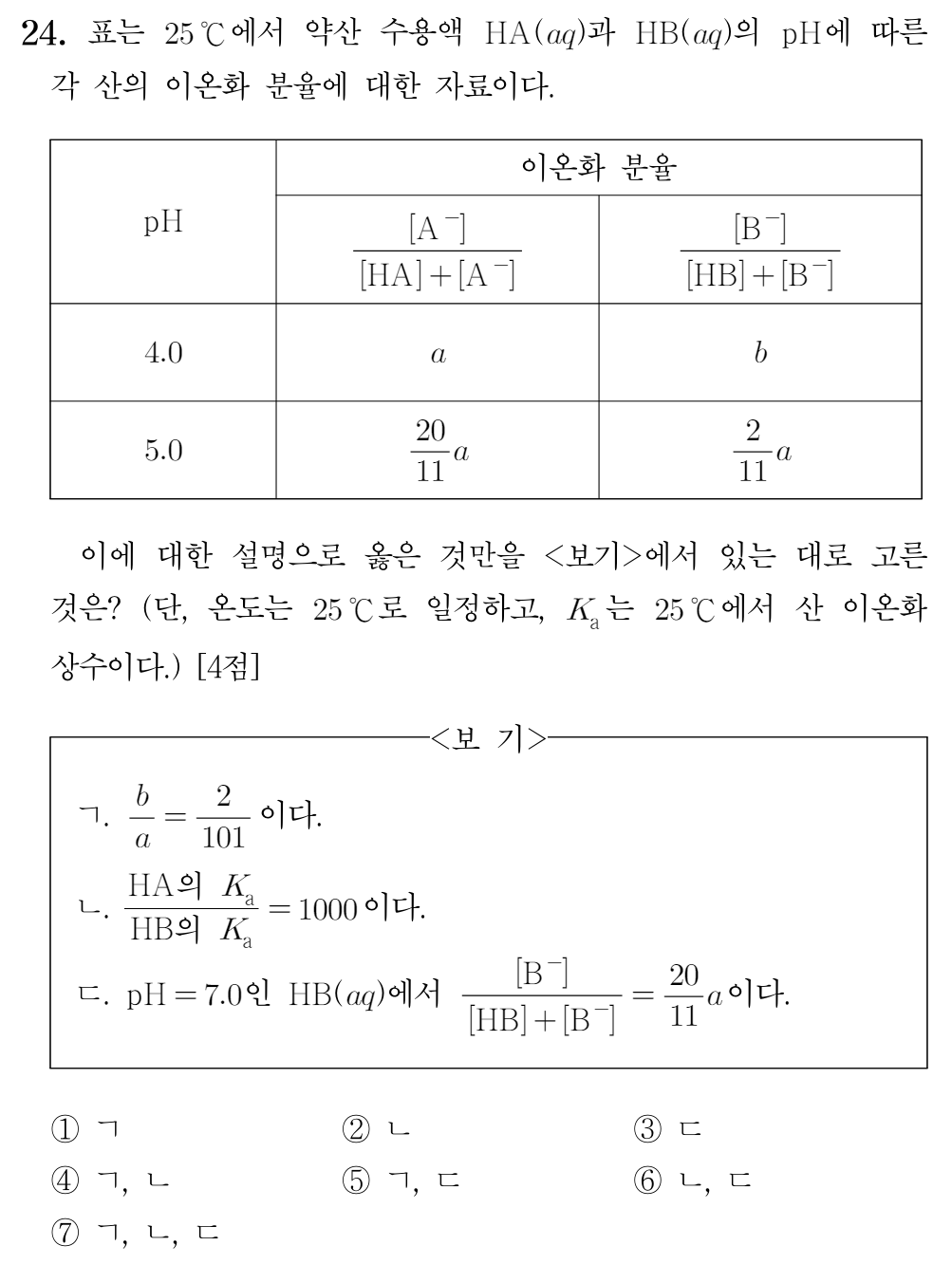 ㄷ. pKa = 6인, HB 용액의 pH가 7이 되기 위해서는 짝산 : 짝염기 비율이 1 : 10이 되어야 하며, B-의 분율은 10/11 = 20a/11 이 된다. (참)