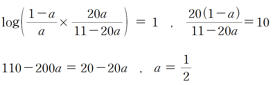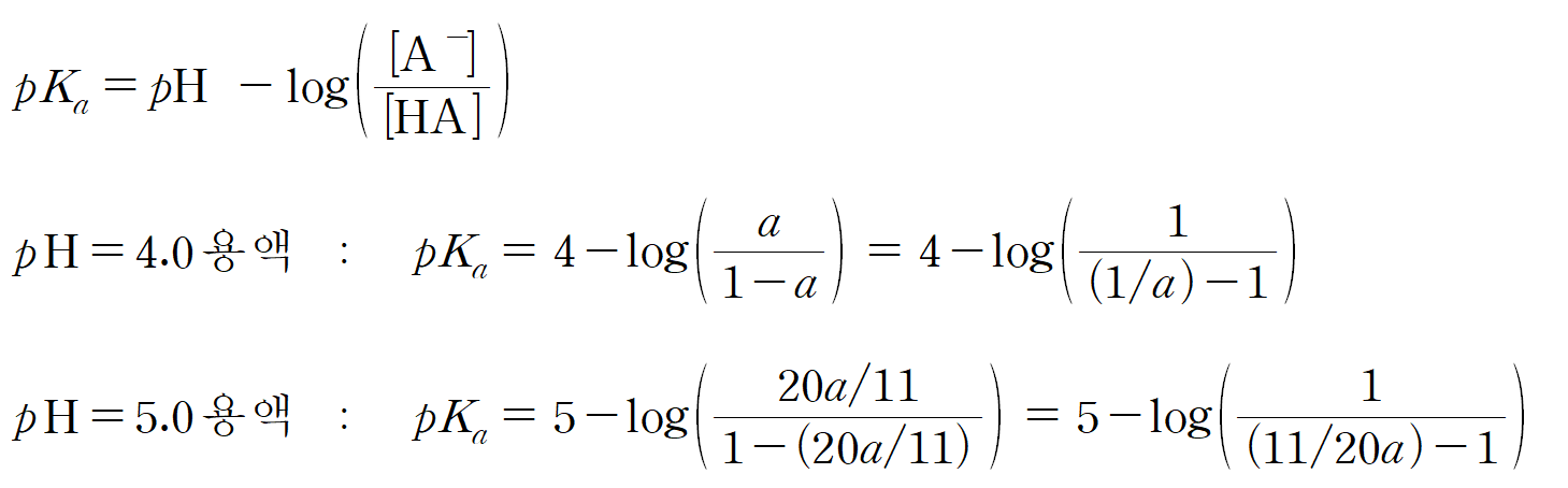 HA의 용액의 pKa는 주어진 pH에 무관하게 일정하므로, 헨더슨-하셀바흐 식을 통해 연립하면 a를 구할 수 있다. log와 분수 때문에 복잡해 보이지만, 직접 손으로 하다보면, 의외로 복잡하지는 않다.