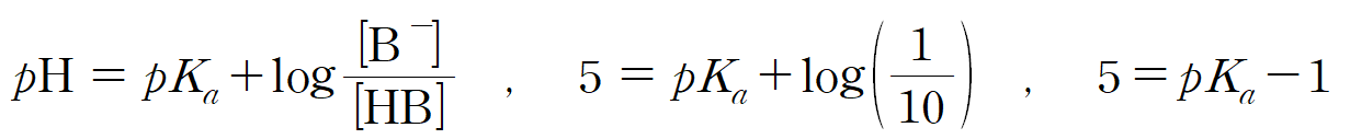 pH = 5 인 HB 용액의 [B-] 분율이 2a/11 이므로, 1/11이다. 이는 [HB] = 10 일 때, [B-] = 1이라는 뜻이다. 짝산 : 짝염기 비율이 10 : 1이고, pH가 5이므로, 약산 HB의 pKa = 6이다.