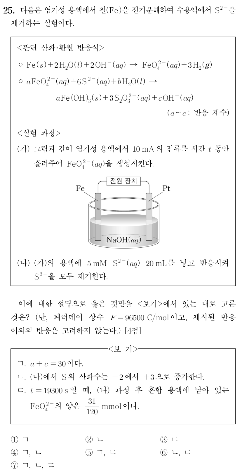 반응 (가)에서 철(Fe)의 산화수 변화는 +6이며, 1개의 금속 철이 산화되는데 관여하는 전자 또한 6 개이다. 전류를 흘려 관여한 전체 전자수가 2 mmol이었으므로, 산화된 철 원자는 1/3 mmol의 철 원자만 산화되었다. 생성된 FeO42- 이온의 양 또한 1/3 = 10/30 mmol이다.