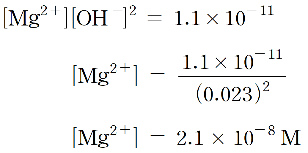 (b) 그리고, 수용액 내 OH- 농도가 0.023 M 일 때, 용액 내 남아있는 [Mg2+]를 구해보면, 다음과 같다.