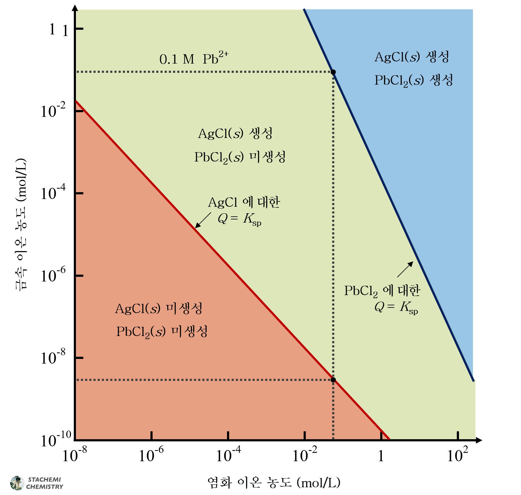AgCl의 용해 평형 그래프는 -1의 기울기를, PbCl2 용해 평형 그래프는 -2의 기울기로 나타나며, 각 직선에 의해 나뉜 구획에 따라 침전 생성 유무를 알 수 있다.