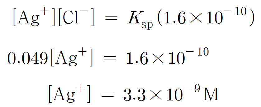 그렇다면, 용액 내 Cl- 농도가 정확하게 0.049 M일 때, 혼합 용액 내 Ag+은 얼마나 남아있을까? 용액 내 남아있는 Ag+, Cl- 이온 농도 곱 = [Ag+][Cl-] = Ksp 값을 만족해야 하기 때문에, [Ag+] 값이 절대로 0이 되지는 않겠지만, 두 이온을 대부분 분리했다고 말할 정도는 될까?