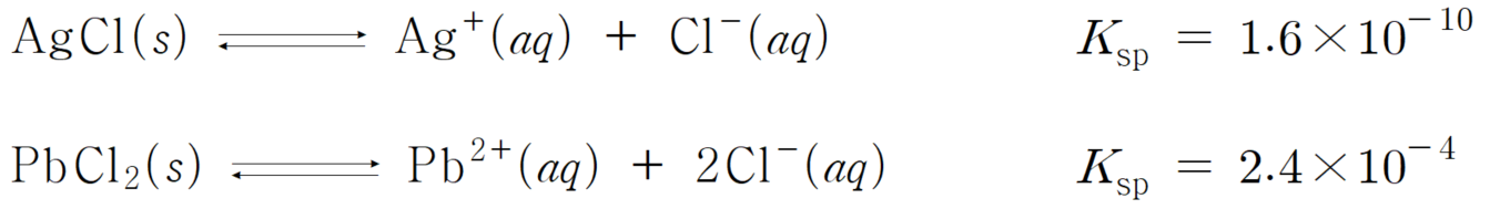 두 금속 이온 모두 Cl-과 반응해서 각각 염화 은(AgCl), 염화 납(PbCl2) 침전을 만들 수 있으며, 생성된 AgCl과 PbCl2의 용해 평형 반응식과 용해도곱 상수(Ksp)를 보면, 물에 잘 녹지 않음을 알 수 있다.